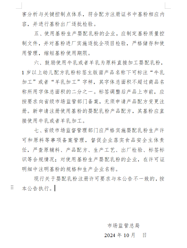 为进一步提高婴幼儿配方乳粉质量安全,依据《食品安全法》及婴幼儿配方乳粉注册许可有关规定,市场监管总局组织起草了《关于进一步加强婴幼儿配方乳粉原辅料管理有关事宜的公告(征求意见稿)》,现面向社会公开征求意见。欢迎各有关单位和个人提出修改意见,并于2024年11月17日前反馈市场监管总局。公众可通过以下途径和方式提出意见: