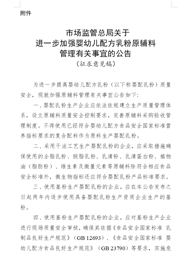 关于进一步加强婴幼儿配方乳粉原辅料管理有关事宜的公告(征求意见稿)